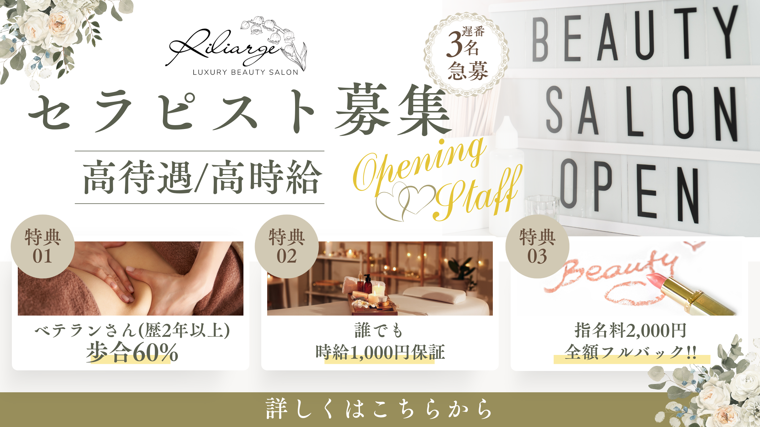 店 名 Riliarge~リリアージュ~住 所 岡山県岡山市北区業 種 メンズエステ(一般エステ)職 種 セラピスト勤務地 備前西市周辺勤務時間 12:00~翌5:00の間1日5時間以上 完全自由勤務(5時間未満は要相談)応募資格 18歳以上の女性(高校生不可)待 遇 ◆衛生管理抜群の綺麗なお部屋 ◆非風俗の本格派アロマエステ ◆ワンルーム完全個室待機 ◆お部屋(待機)は他のセラピストさんと一緒になる事はありません。※完全プライベートをお約束致します。 ◆無料研修が何度でも受けられます ◆未経験スタートOK ◆ノルマ・引かれもの・罰金等一切無し ◆完全自由出勤 ◆当日急な出勤可能 ◆wi-fi完備